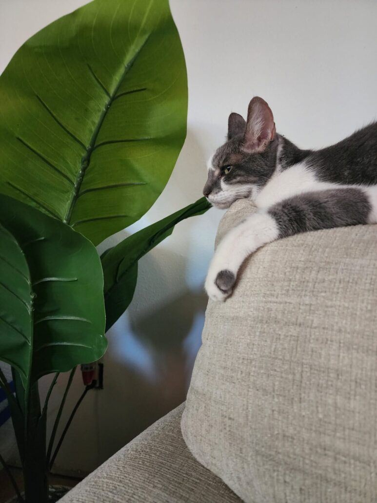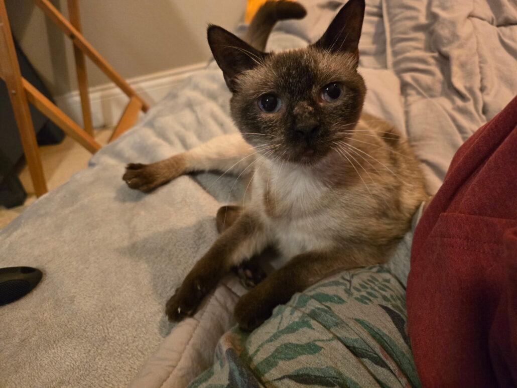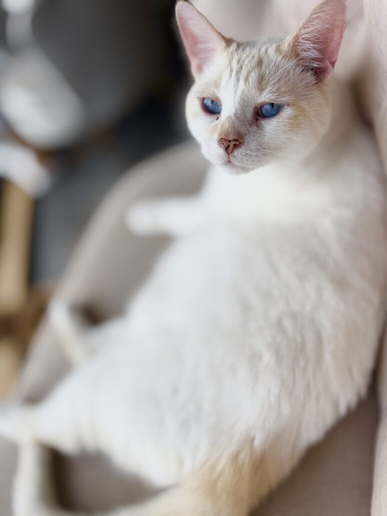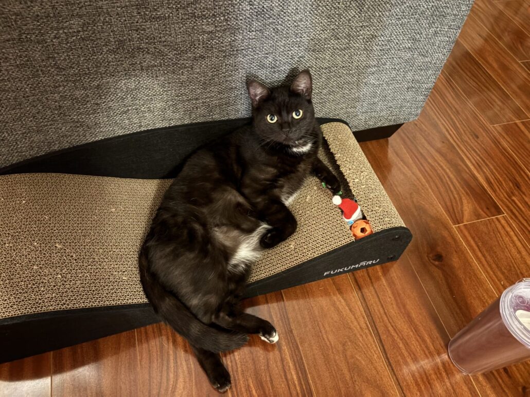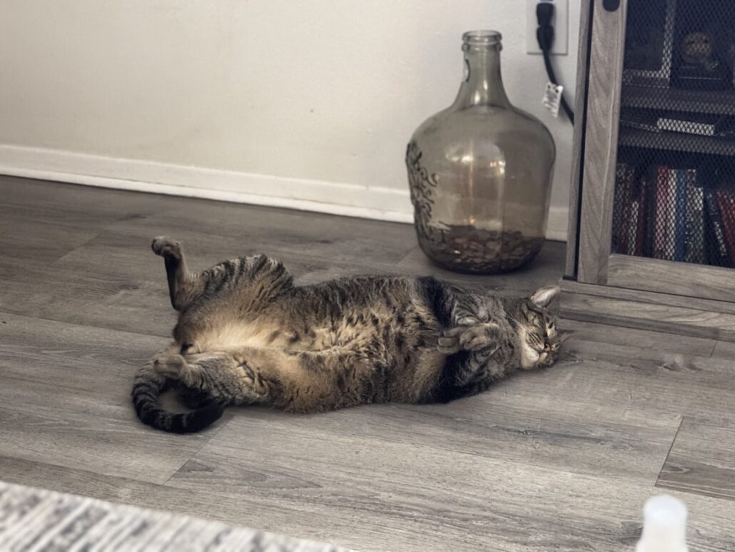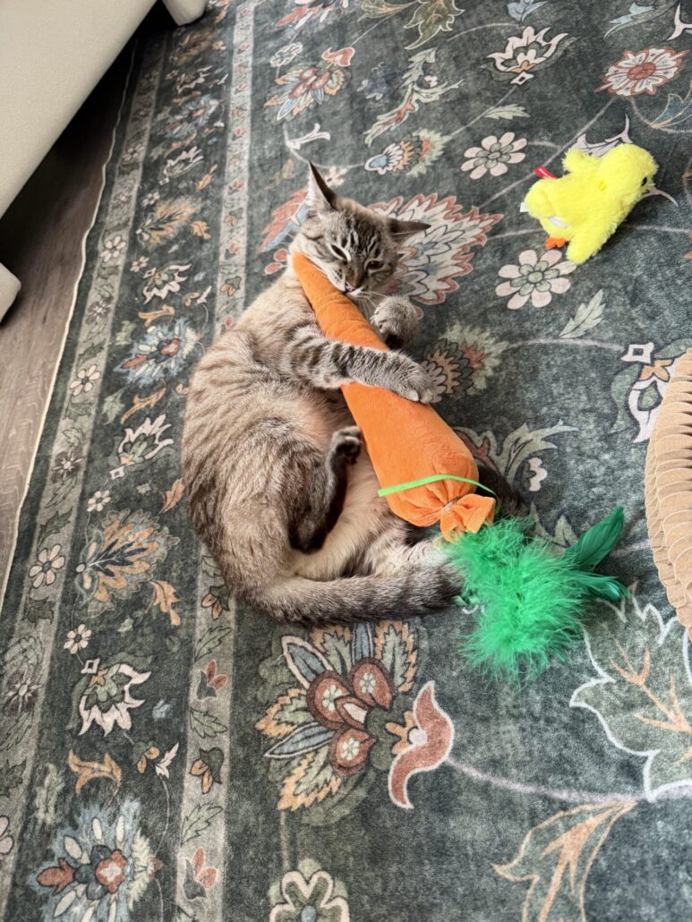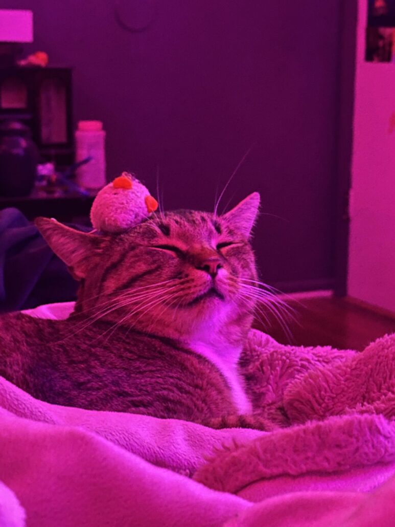 Currently, Merlin is 18, a little bigger from being spoiled, his heart open to bonding with other kitties — especially the ones born with us — with a permanent sleeping spot on Ally’s pillow above her head, and his own personal back scratcher/petter that he calls for or taps when he wants attention. Merlin also loves bringing toys he thinks she’d enjoy playing with.